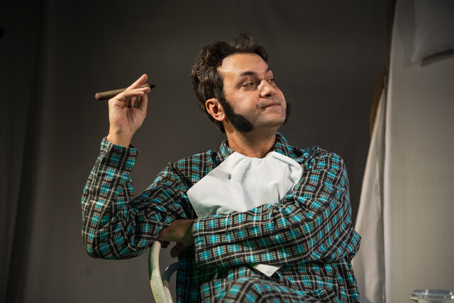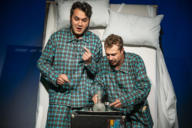 Вот насколько сложная задача стояла перед постановщиками спектакля Тарасом Кузьминым и Геннадием Бабиновым. Из всей «Современной идиллии» они выбрали линию с двумя героями – безымянным рассказчиком (Г. Бабинов) и его другом Глумовым (Т. Кузьмин), заурядными питерскими обывателями, построившими свое существование на моральном принципе, что, мол, «времена сейчас тяжелые, надо бы погодить». Погодить в данном случае означает отказаться от творчества, переустройства жизни, общественной деятельности, предпочтя им мелкие удовольствия жизни – пить кофий по утрам, есть вкусные щи и сало в ресторане, фланировать по улицам, ведя при этом поразительные по бессодержательности беседы. Глумов и Рассказчик настолько оторваны от реальной жизни, настолько погружены в свое вегетативное существование, что все время действия остаются на сцене в пижамах, это смешно. А в конце появляются с наетыми боками и животами, два карикатурных толстяка. И все время озабоченно говорят друг другу – надо бы погодить, не то сейчас время…
