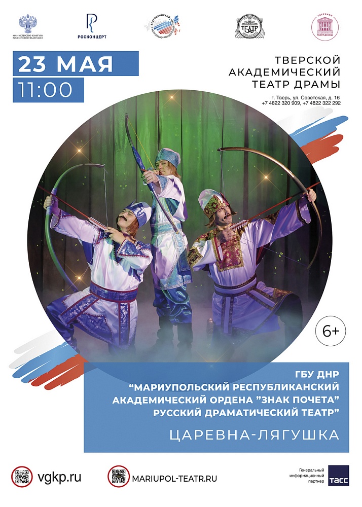 С 14 по 27 мая 2026 года состоятся гастроли ГБУ «МАРИУПОЛЬСКИЙ РЕСПУБЛИКАНСКИЙ АКАДЕМИЧЕСКИЙ ОРДЕНА «ЗНАК ПОЧЕТА» РУССКИЙ ДРАМАТИЧЕСКИЙ ТЕАТР» в Выборге, Пскове, Новгороде Великом, Лодейном поле, Твери и Вышнем Волочке, организованные ФГБУК РОСКОНЦЕРТ согласно Всероссийскому гастрольно-концертному плану Министерства культуры Российской Федерации. На сцене Тверского областного академического театра драмы пройдут показы спектаклей "Царевна-лягушка", "Любимчик императрицы".