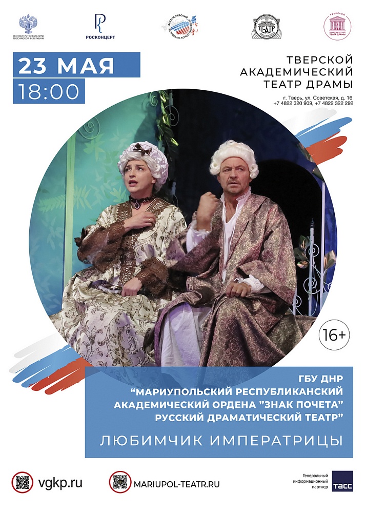 С 14 по 27 мая 2026 года состоятся гастроли ГБУ «МАРИУПОЛЬСКИЙ РЕСПУБЛИКАНСКИЙ АКАДЕМИЧЕСКИЙ ОРДЕНА «ЗНАК ПОЧЕТА» РУССКИЙ ДРАМАТИЧЕСКИЙ ТЕАТР» в Выборге, Пскове, Новгороде Великом, Лодейном поле, Твери и Вышнем Волочке, организованные ФГБУК РОСКОНЦЕРТ согласно Всероссийскому гастрольно-концертному плану Министерства культуры Российской Федерации. На сцене Тверского областного академического театра драмы пройдут показы спектаклей "Царевна-лягушка", "Любимчик императрицы".